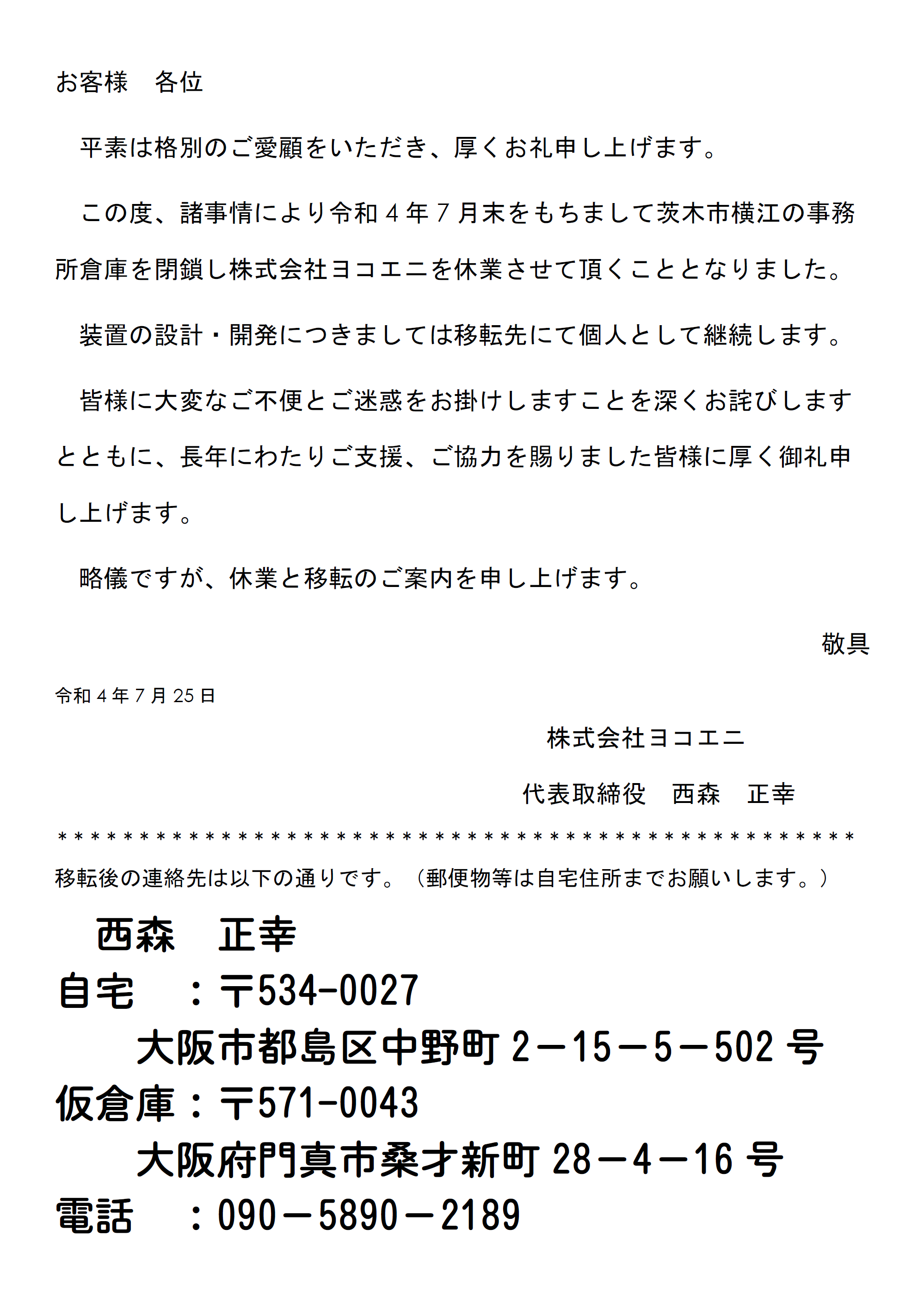 - 茨木事務所倉庫を閉鎖、株式会社ヨコエニを休業させて頂くこととなりました。